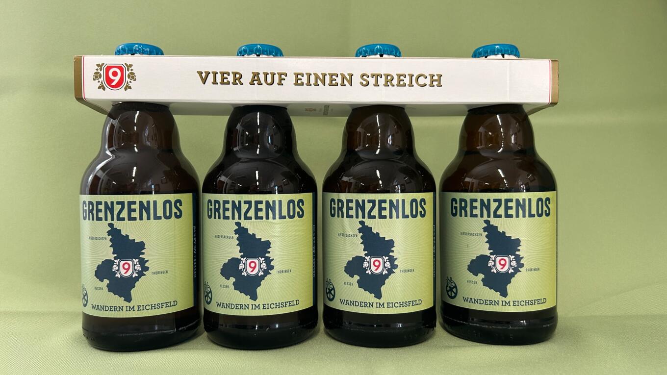 Das Logo des Wanderbieres präsentiert den Grundriss des Eichsfeldes, das sich über die Bundesländer Thüringen, Hessen und Niedersachsen erstreckt. Unter dem Motto "Grenzenlos wandern im Eichsfeld" lädt das Bier dazu ein, die Vielfalt und Schönheit dieser grenzüberschreitenden Region zu entdecken.